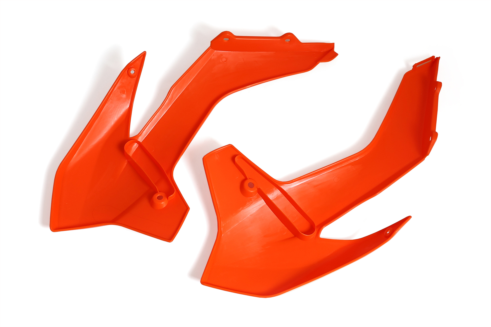 Пара оранжевых передних обтекателей для мотоциклов KTM SX85 2013-2016 года, а также аналогичных китайских моделей на раме K5 (Kayo K1, BRZ X5 и др.). Изготовлены из высококачественного, ударопрочного пластика под тип KTM SX85. Полный аналог оригинальной детали KTM с артикулом 4710805400004. Детали придают байку яркий внешний вид, обеспечивают отличную защиту и легко устанавливаются на штатные крепления без доработок.