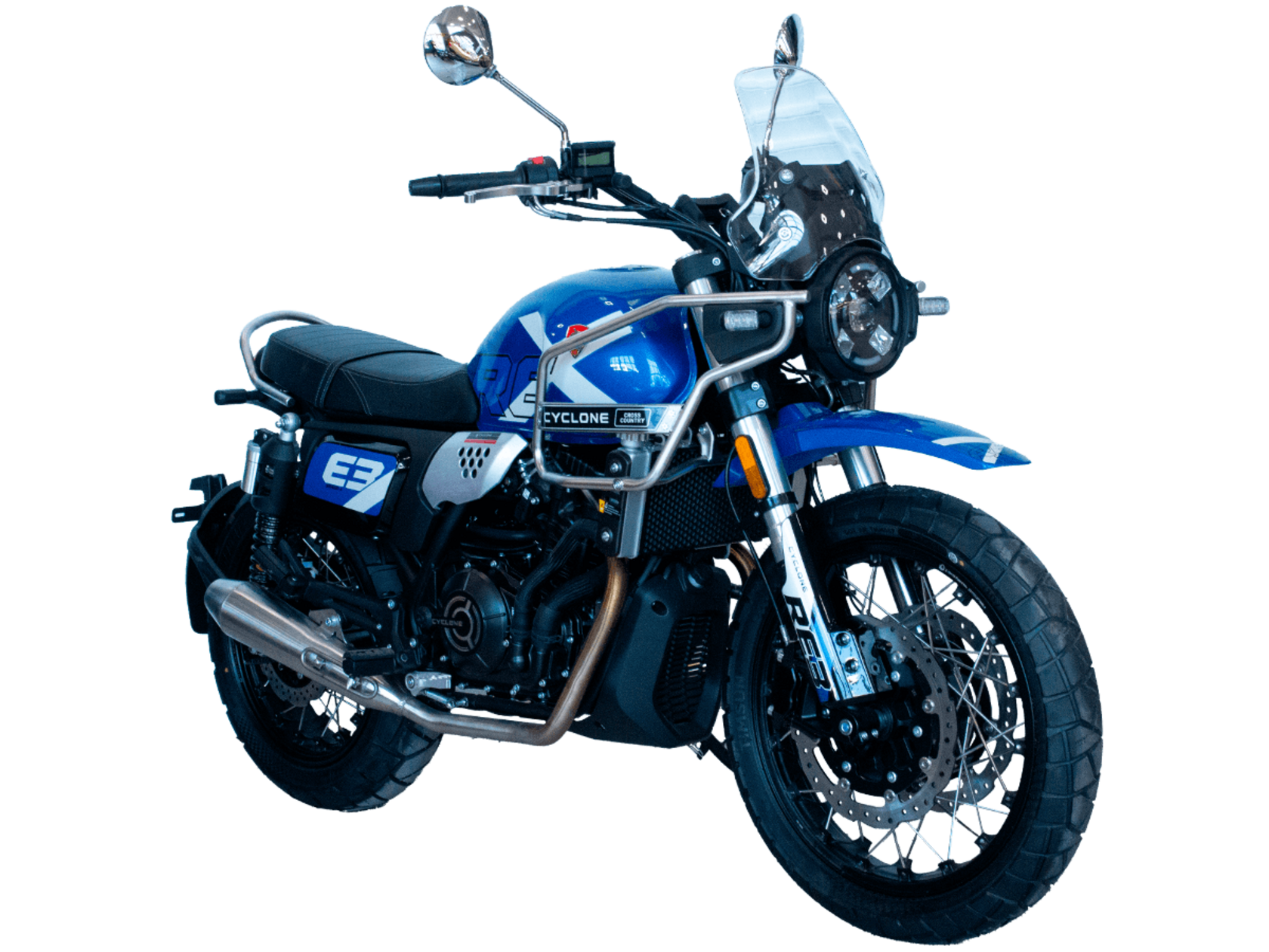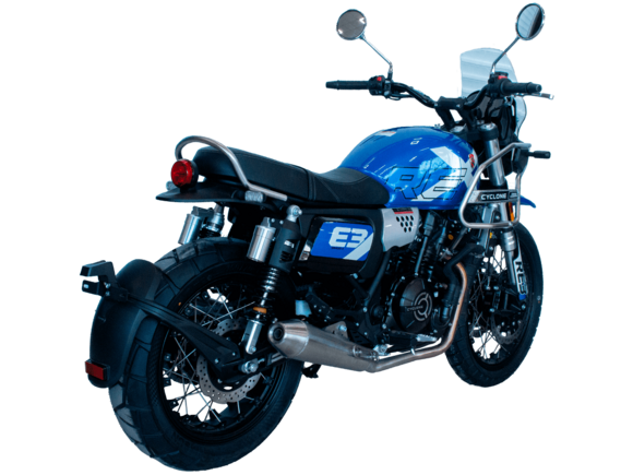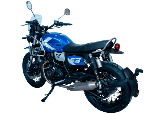 CYCLONE RE3 Scrambler (SR400-A) – универсальный мотоцикл, объединяющий в себе черты городского мотоцикла и эндуро. Управляя им, можно бросить вызов и городским пробкам, и скоростным автострадам, и всевозможному лёгкому бездорожью. Его дизайн отдаёт дань уважения каферейсерской тематике.Двухцилиндровый четырёхтактный двигатель объёмом 401 см3 выдаёт 43 л.с. на 9500 об/мин. Инжекторный впрыск топлива с инжектором BOSCH увеличивает топливную экономичность, а также позволяет добиться высокой приёмистости и неприхотливости агрегата. Жидкостная система охлаждения не допустит перегрева двигателя даже при самом агрессивном вождении. На мотоцикл установлена 6-ступенчатая механическая коробка передач.Максимальная скорость мотоцикла составляет 140 км/ч.Мотоцикл оснащён классическими спицованными колёсами диаметром 17 и 19 дюймов и имеет достаточно большой дорожный просвет – 22 см. С неровностями дороги эффективно справляются телескопическая вилка перевёрнутого типа спереди и маятник с двумя амортизаторами сзади. Ход передней подвески составляет 130 мм, задней – 81 мм. Оба компонента подвески являются регулируемыми. Эффективное и безопасное замедление с любых скоростей обеспечивают гидравлические дисковые тормоза с ABS спереди и сзади.Клиренс мотоцикла составляет 220 мм. Объём топливного бака – 19 л. Снаряжённая масса – 200 кг.На данной модели штатно установлены дуги безопасности, а также имеется бортовой компьютер с цветным дисплеем, USB-порт и подсветка пультов.RE3 Scrambler сочетает в себе отличные технические характеристики, комфорт и надёжность, что позволяет вам ощутить настоящую свободу на любой дороге с любым покрытием.