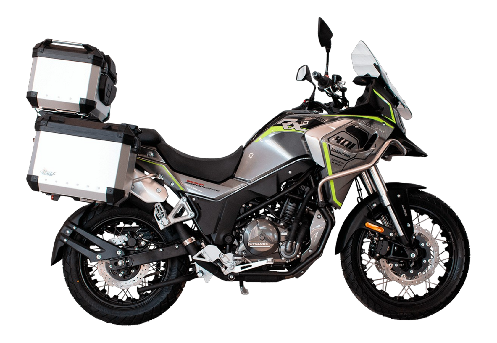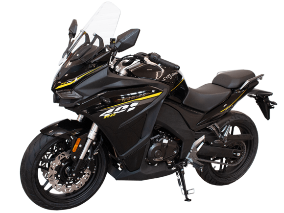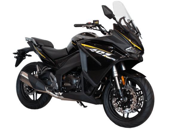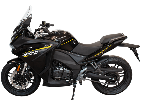 Мотоцикл CYCLONE RX401 (SR400GY-2D) – туристический эндуро, готовый бросить вызов любым дорогам и расстояниям. За рулём этого мотоцикла для вас не будет невозможных маршрутов. Его агрессивный дизайн всецело соответствует традициям жанра данного класса мототехники.Рядный двухцилиндровый четырёхтактный двигатель объёмом 401 см3 выдаёт 43 л.с. на 9500 об/мин. Максимальный крутящий момент достигается на 8000 об/мин и составляет 37 Н·м. Инжекторный впрыск топлива с блоком управления BOSCH увеличивает топливную экономичность, а также позволяет добиться высокой приёмистости и неприхотливости агрегата. Жидкостная система охлаждения не допустит перегрева двигателя даже при самом агрессивном вождении. На мотоцикл 6-ступенчатая механическая коробка передач.Максимальная скорость мотоцикла составляет 139 км/ч.RX401 оснащён спицованными алюминиевыми колёсами диаметром 17 и 19 дюймов. Колёса обуты в бескамерные покрышки от фирмы CST. С неровностями дороги эффективно справляются телескопическая вилка перевёрнутого типа спереди и маятник с моноамортизатором сзади. Ход передней подвески составляет 130 мм, задней – 55 мм. Оба компонента подвески являются регулируемыми. Эффективное и безопасное замедление с любых скоростей обеспечивают гидравлические дисковые тормоза с двухканальной системой ABS спереди и сзади.Клиренс мотоцикла составляет 185 мм. Объём топливного бака – 20 л. Снаряжённая масса – 215 кг.Мотоцикл отличает хорошо продуманная компоновка с высоко расположенным радиатором. На данной модели штатно установлены дуги безопасности, защита картера и двигателя, а также багажник с креплениями для боковых кофров. Кроме того, мотоцикл снабжён центральной подножкой для лёгкого обслуживания цепи, колес и вилки.Бортовой компьютер оборудован цветным дисплеем привлекательного дизайна со специальным защитным козырьком, спасающим от брызг и бликов. Из других приятных мелочей в допоборудовании мотоцикла стоит выделить 12-вольтовую розетку, подсветку пультов и USB-порт.Мотоцикл сочетает в себе отличные технические характеристики, комфорт и надёжность, что позволяет вам ощутить настоящую свободу на любой дороге с любым покрытием.