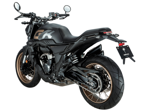 Мотоцикл ZONTES ZT350-GK – современный неоклассик для покорения городских пространств. Хорошо проявляет себя как в тесном межрядье, так и на свободных трассах.Силовая установка представлена одноцилиндровым 4-тактным двигателем ZT184MP с 4 клапанами и 2 верхними распредвалами. Двигатель имеет объём 348 см³ и обеспечивает мощность в 39 л.с. Оснащён инжектором BOSCH и системой жидкостного охлаждения. Механическая коробка передач имеет 6 ступеней и схему 1-N-2-3-4-5-6. Запуск двигателя осуществляется с помощью бесключевого доступа.Ёмкость топливного бака 17 литров.Бескамерные спицованные колёса имеют диаметр 17 дюймов. На мотоцикл установлены датчики давления в шинах, показатели от которых выводятся на приборную панель. Для подвески спереди используется телескопическая вилка, сзади – моноамортизатор. Гидравлические дисковые тормоза произведены испанской компанией J.JUAN, входящей в холдинг BREMBO. Передний тормозной диск скрыт под защитным кожухом.В конструкции мотоцикла используется трубчатая стальная рама. Рычаги тормоза и сцепления, а также лапки КПП можно отрегулировать. Рычаги снабжены защитными скобами. Для освещения используется яркая LED-оптика, а приборная панель представлена цифровым дисплеем. Имеется 2 USB-порта.Габариты мотоцикла 2070х845х1120 мм. Колёсная база 1390 мм. Высота по седлу 795 мм. Вес 169 кг.