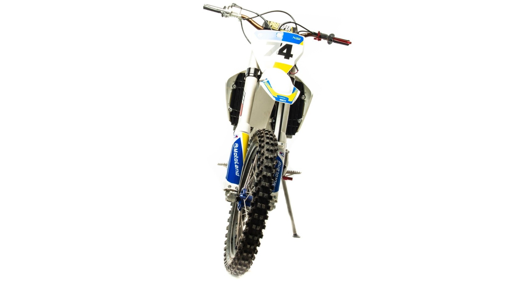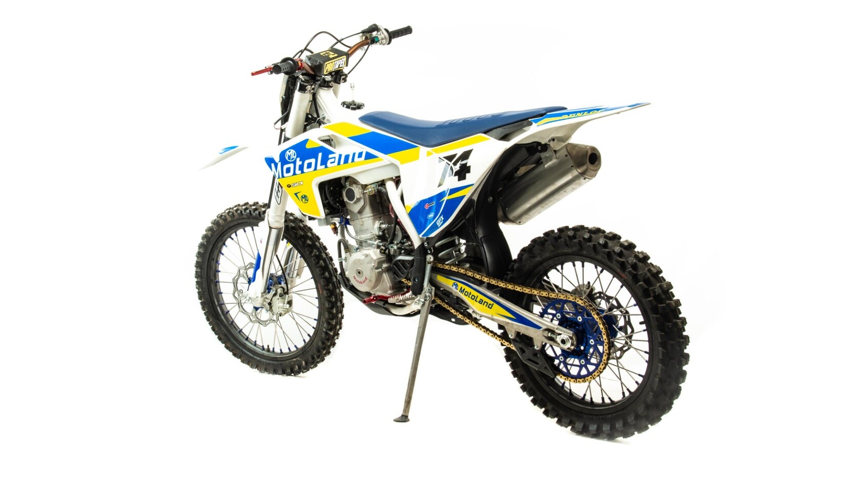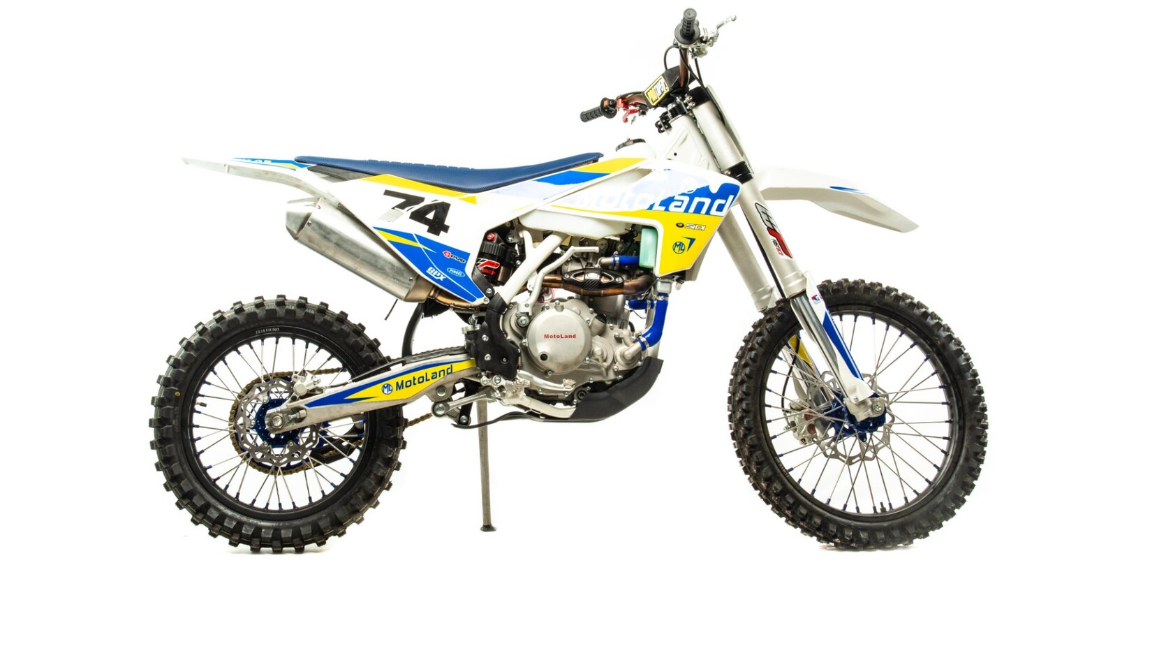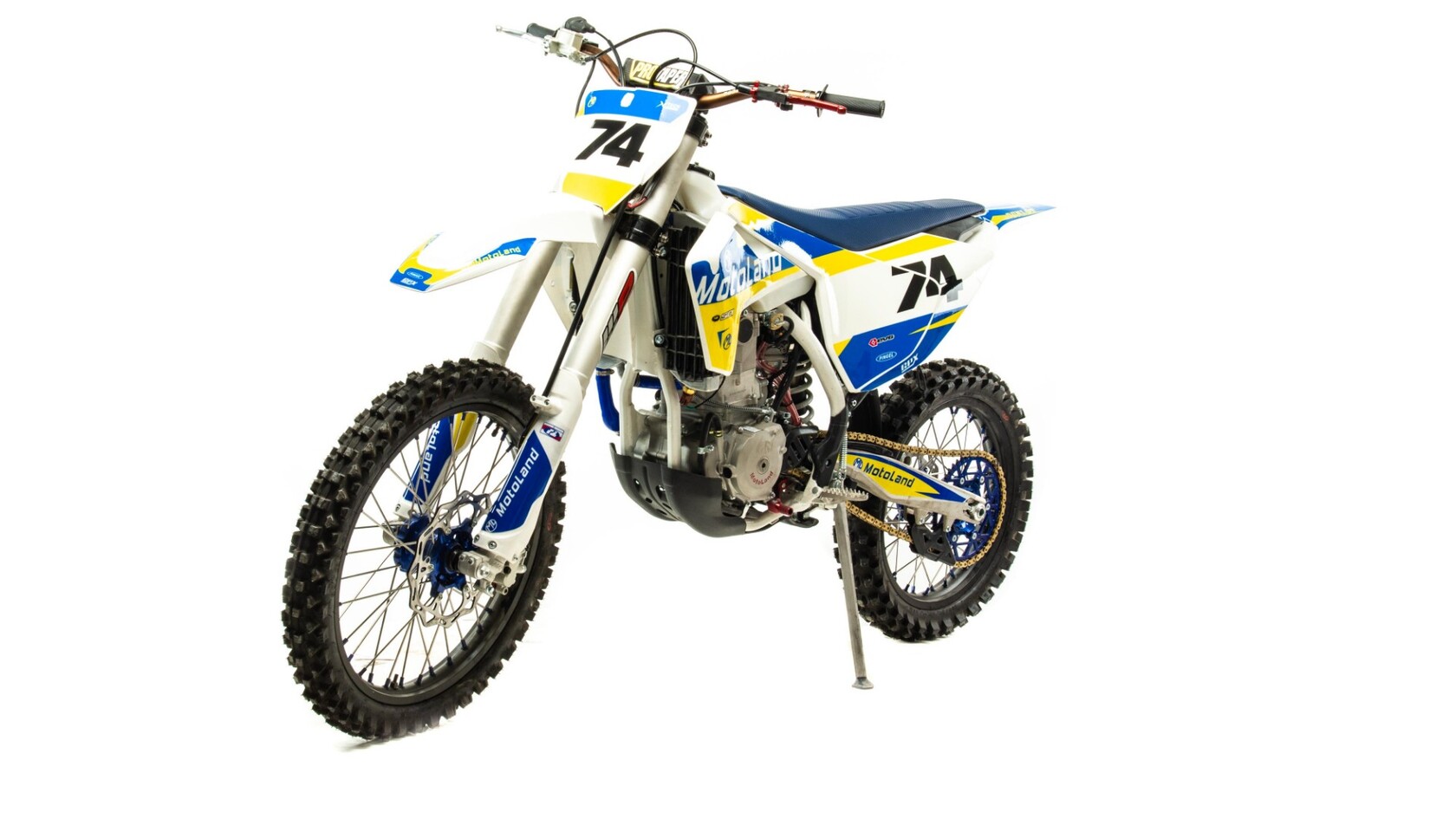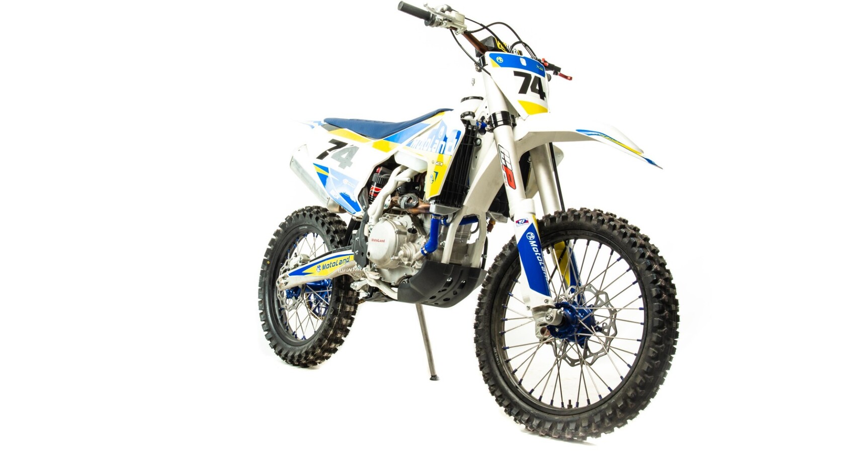 Мотоцикл Motoland XT300 STНадёжная техника оснащенная двигателем 174FMN-3 с водяным охлаждением. с кикстартером и электростартером, Мощностью 26 Л.С. на двигателе установлен Карбюратор NIBBI n34 с ускорительным насосом.Это полноразмерный кроссовый мотоцикл его база по осям составляет 1400 мм., и габаритами 2100х800х1120 мм. Высота по седлу составляет 950 мм. Передние и задний амортизаторы с регулировками.За счет сбалансированной базы мотоцикл имеет отличную управляемость, а конструкция рамы и особенности настройки подвески GPX способствуют максимальному поглощению неровностей дорожного покрытия, а так же усиленная прогрессия на игольчатых подшипниках. Алюминиевые обода c антибуксаторами, усиленными спицами и ступицами.На кроссовой резине 80/100-21 / 110/100-18На мотоцикле установлена обновлённая тормозная система обеспечивающая отличные тормозные характеристики. Глушитель с уникальным дизайном прямоточного типа, полностью алюминиевый для облегчения веса.
