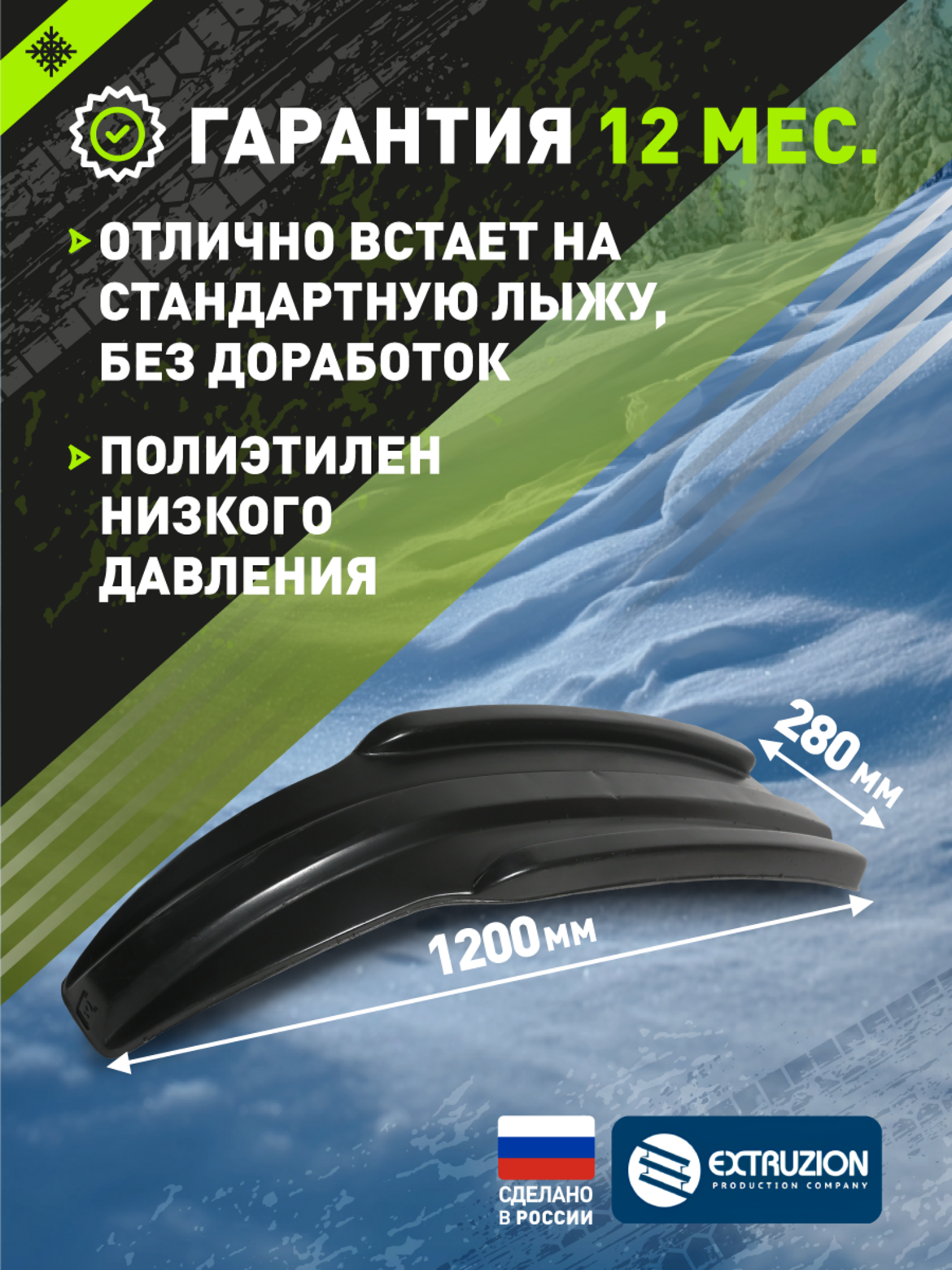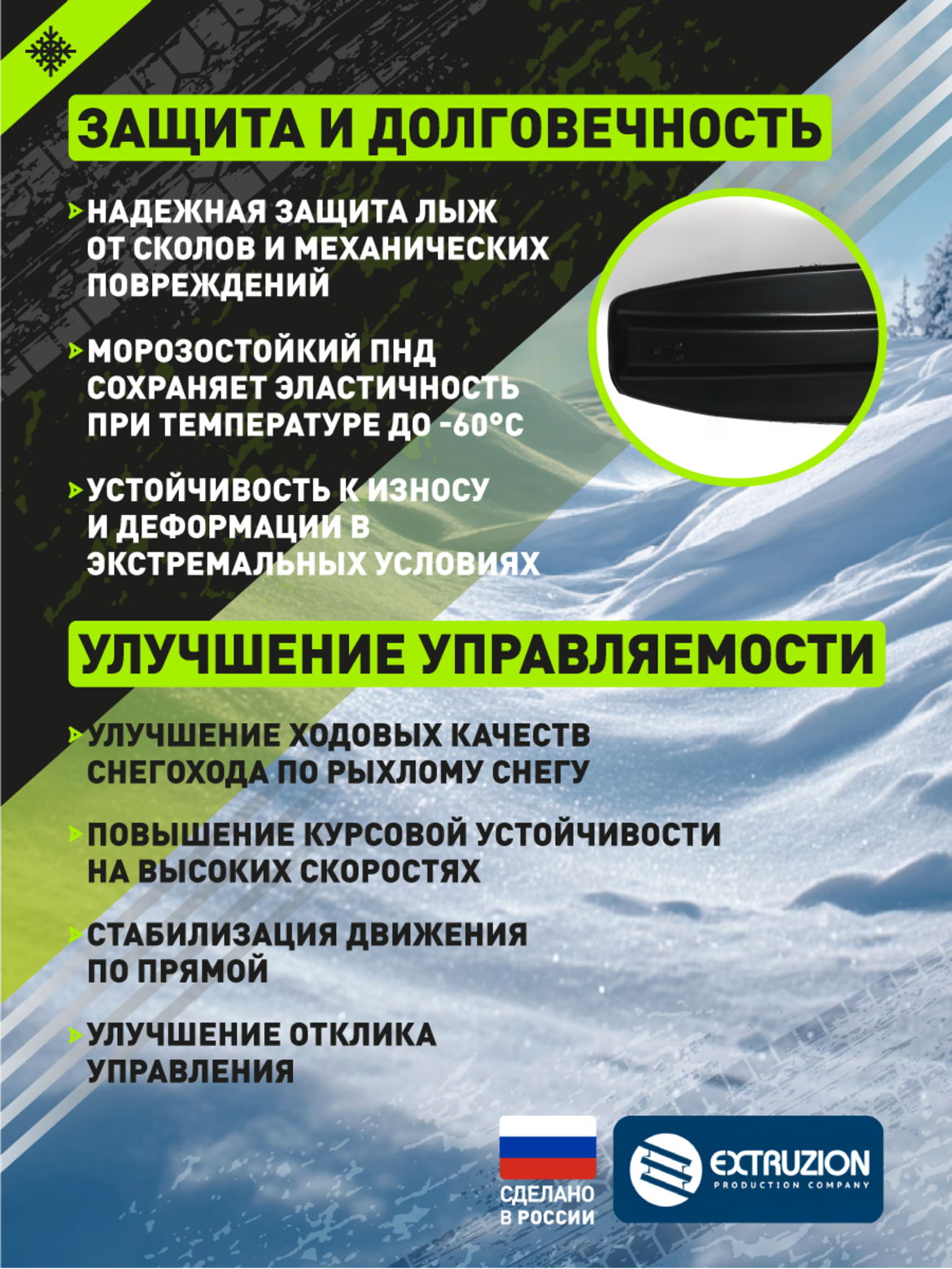 Надежная защита лыж. Предотвращение износа и повреждений основной лыжи Морозостойкий ПНД сохраняет гибкость при -60C Устойчивость к механическим воздействиям и абразивному износу