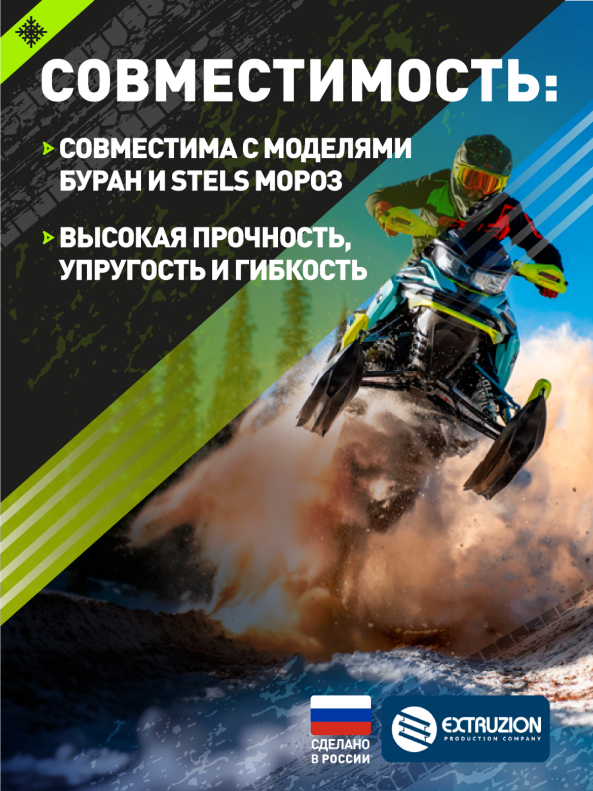 Улучшенная проходимость. Повышение плавучести на рыхлом снегу Обеспечение лучшего сцепления в глубоком снегу Эффективное преодоление сложных участков бездорожья