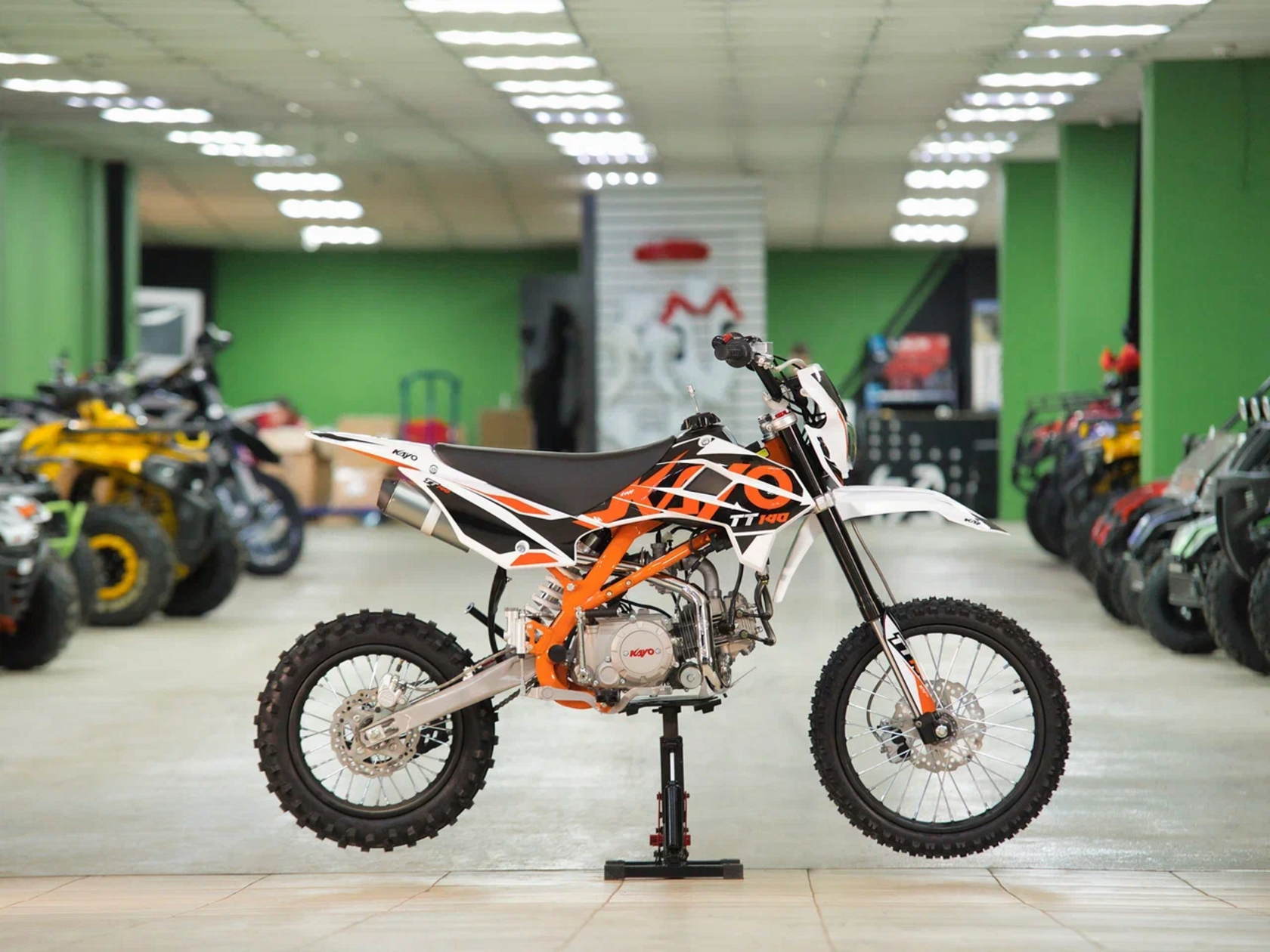 Питбайк KAYO Basic TT140EM KRZ – простой в обслуживании и выносливый байк для тренировок. Рекомендован подросткам, которые готовятся к соревнованиям, но подойдёт и для повседневных прокатов.Одноцилиндровый 4-тактный двигатель воздушно-масляного охлаждения YX1P56FMJ объёмом 140 см3, выдаёт 11 л.с. Карбюратор NIBBI PE19 обеспечивает бесперебойную работу техники в самых жёстких условиях эксплуатации, простоту и лёгкость в обслуживании, а также неприхотливость к качеству топлива. Питбайк имеет вместительный топливный бак на 5,5 л. Питбайк оснащён механической 4-ступенчатой коробкой передач с формулой “N-1-2-3-4”. Запуск двигателя осуществляется с помощью рычага кикстартера.Мотоцикл имеет вес всего 72 кг. Усиленная рама из хром-молибденового сплава и подвеска позволяют эффективно амортизировать удары при езде по неровностям и препятствиям на трассе. Передняя подвеска — телескопическая вилка перевёрнутого типа длиной 770 мм, задняя — моноамортизатор длиной 360 мм. Оба компонента подвески являются нерегулируемыми. Рама и пластик являются собственной разработкой производителя. Мотоцикл оснащён классическими стальными спицованными колёсами диаметром 17 дюймов спереди и 14 дюймов сзади. Эффективное и безопасное замедление с любых скоростей обеспечивают гидравлические дисковые тормоза. Высококачественная износостойкая резина с развитым протектором отлично держит дорогу на различных типах покрытия.Питбайк оснащён яркой светодиодной линзованной фарой, позволяющей кататься в тёмное время суток.Если вы ищете послушный, компактный, динамичный и красивый питбайк, считайте, что вы его нашли. Это один из лучших мотоциклов для обучения и первых шагов в эндуро и мотокроссе. Он отлично подойдёт как для гонок на трассе, так и для обычного катания по пересечённой местности.
