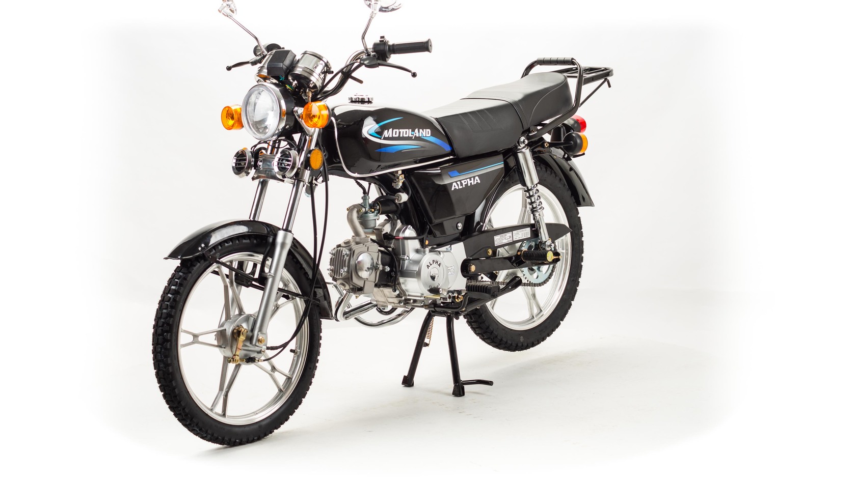 MotoLand Alpha 11 это всеми полюбившейся мопед который не нуждается в представлении.Мопед можно использовать для самых различных целей: для одиночного или совместного передвижения в городском потоке, сельской местности, поездки на природу, рыбалку и охотуПри этом он универсален и подходит мотолюбителям любого возраста,и опыта вождения.Для подростков, подойдет как подарок и первый мотоцикл для только начинающего свое знакомство с миром мототехникиВзрослых, которым нужна техника для поездок из точки А в точку Б и обратно, именно в таком режиме он способен показать себя с лучшей стороны.Мопед полностью отвечает требованиям к безопасному движению по городу и за городом: оснащен фарой дальнего и ближнего света, поворотниками, стоп-сигналом, звуковым сигналом, зеркалами заднего вида, габаритными светоотражателямиДля того чтобы ездить на мопеде, нет необходимости в регистрации в ГАИ и страховка.Техническая сторонаМопед поставляется с 50 кубовым одноцилиндровым четырехтактным двигателем с воздушным охлаждением ZS50-A (139FMB) конструкция которого полностью повторяет знаменитый мотор HONDA CUB.Установлен карбюратор PZ19 с системой обогащения и пуском в любую погоду и время года.Двигатель работает ровно, имеет высокую мощность в широком диапазоне оборотов, что позволяет комфортно трогаться и быть уверенным, что двигатель не заглохнет в неподходящий момент.Двигатель имеет возможность легкого запуска с кнопки на руле, так как имеет электростартер, а при необходимости можно воспользоваться кик стартером.Механическая трансмиссия содержит 4 передачиМопед имеет хорошую динамику разгона, расход 3 л на 100 км, объем бака 7л, которого хватит на 200+км