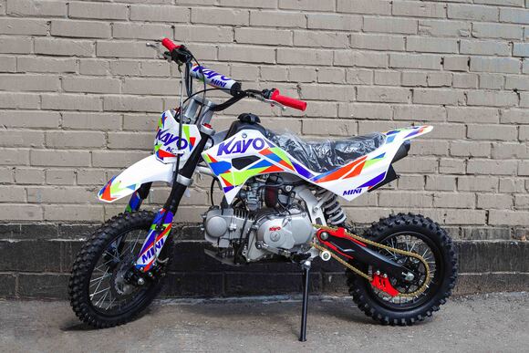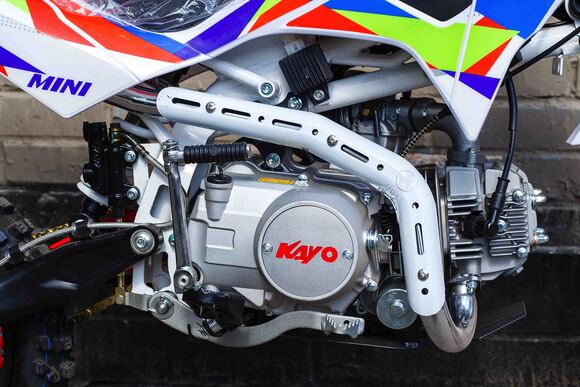 Питбайк KAYO Mini К125EM 14/12 – идеальный снаряд для юных экстремалов, который можно использовать на лёгких кроссовых трассах и дорогах с различным покрытием. Подходит для детей от 10 лет, желающих освоить технику езды на внедорожном мотоцикле. Удобный, простой и надёжный мотоцикл, который полностью оправдывает свою цену.Одноцилиндровый 4-тактный двигатель воздушного охлаждения производства KAYO объёмом 125 см3, выдаёт 9 л.с. Карбюратор NIBBI PE19 обеспечивает бесперебойную работу техники в самых жёстких условиях эксплуатации, простоту и лёгкость в обслуживании, а также неприхотливость к качеству топлива. Питбайк оснащён механической 4-ступенчатой коробкой передач с формулой “N-1-2-3-4”.Аппарат имеет вес всего 70 кг. Усиленная рама из хром-молибденового сплава и подвеска позволяют эффективно амортизировать удары при езде по неровностям и препятствиям на трассе. Передняя подвеска —телескопическая вилка длиной 625 мм, задняя —моноамортизатор 280 мм. Рама и пластик разработаны фирмой KAYO. Мотоцикл оснащён классическими стальными спицованными колёсами диаметром 14 дюймов спереди и 12 дюймов сзади. Эффективное и безопасное замедление с любых скоростей обеспечивают гидравлические дисковые тормоза марки HSK.Высококачественная износостойкая резина с развитым протектором отлично держит дорогу на различных типах покрытия. Аппарат оснащён системой запуска двигателя при помощи кнопки электростартера или при помощи рычага кик-стартера.Если вы ищете послушный, компактный, шустрый, красивый питбайк для своего малыша, считайте, что вы его нашли. Это один из лучших мотоциклов для обучения и первых шагов в эндуро и мотокроссе. Он отлично подойдёт как для гонок на трассе, так и для покатушек по пересечённой местности.